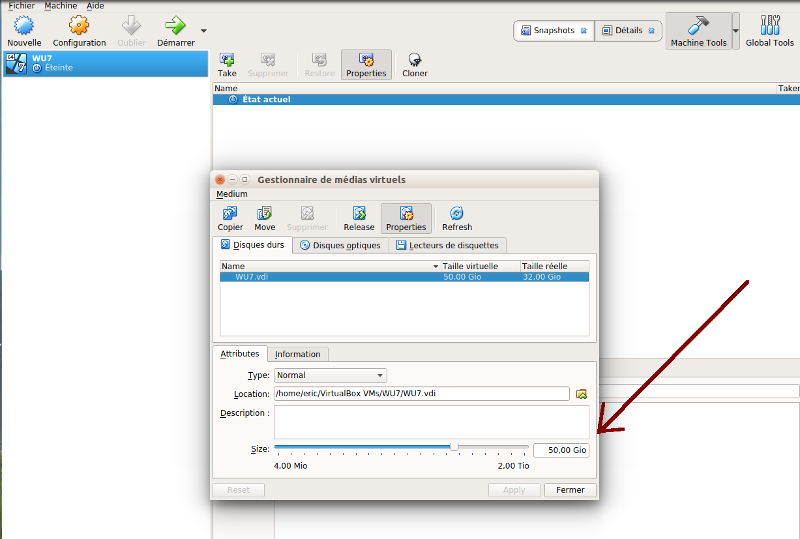 • Utiliser les fonctionnalités de Virtualbox pour changer la taille de la nouvelle partition